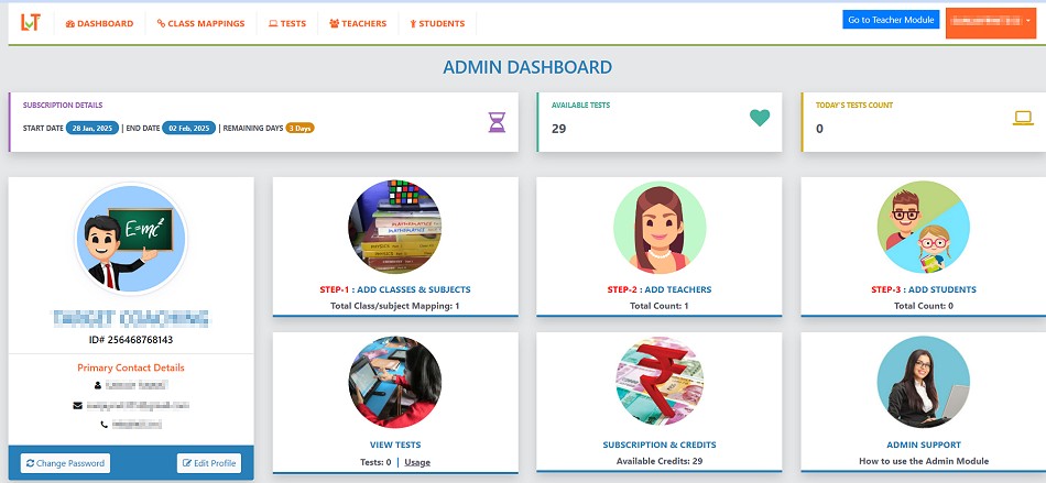 You will reach the admin dashboard on your next login, or you can move to admin module after the initial class-subject selection. You will have various options as shown below on the dashboard. You can also switch to the Teacher module directly from here.