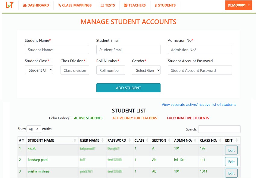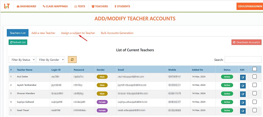 By default, a teacher ID is mapped to your admin ID, which you can use to create tests as a teacher. You may see this teacherID as 'adminID-t' in your teacher list.