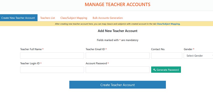 Please note that class-subject mapping is done for the entire school. For individual teachers, you need to assign/map the required classes and subjects from the one mapped at school level. Please refer to the 'Create Teacher IDs' section to create a teacher ID and assign subjects to teacher.