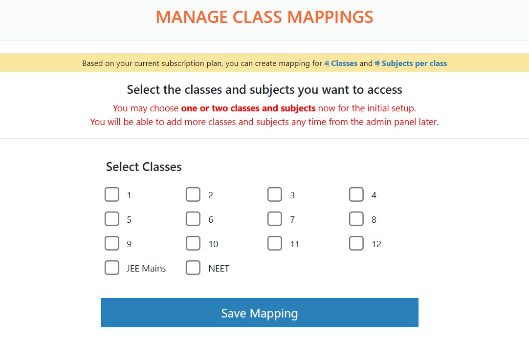 You can map the required class and subjects as allowed in your package from the 'Manage Class Mapping' menu on the dashboard. By default, NCERT books are available for mapping, If you need to add any other books or curriculum, please contact our support team.