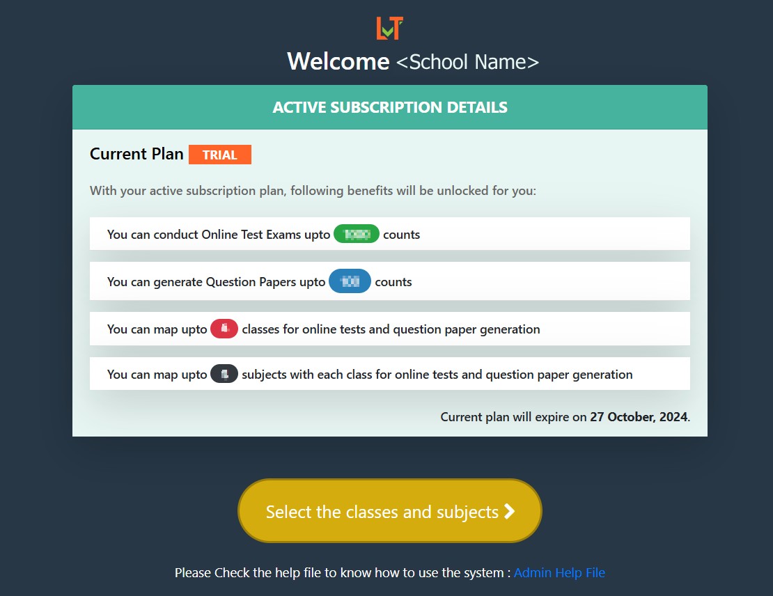 When you login for the first time as a admin, you will need to set the classes and subjects required for your school or institute. If you have registered yourself, you can click on "Select the classes and subjects " to set classes and subjects available. If your registration was done by the LMT team, class/subject-mapping would be already done as required by you.